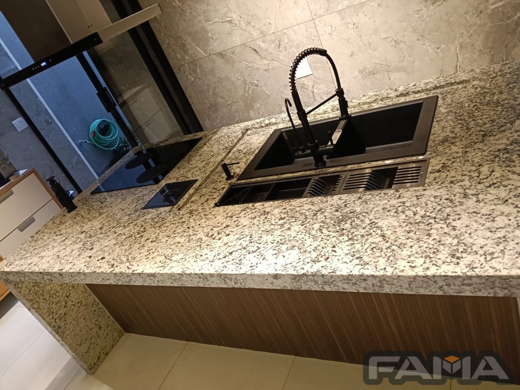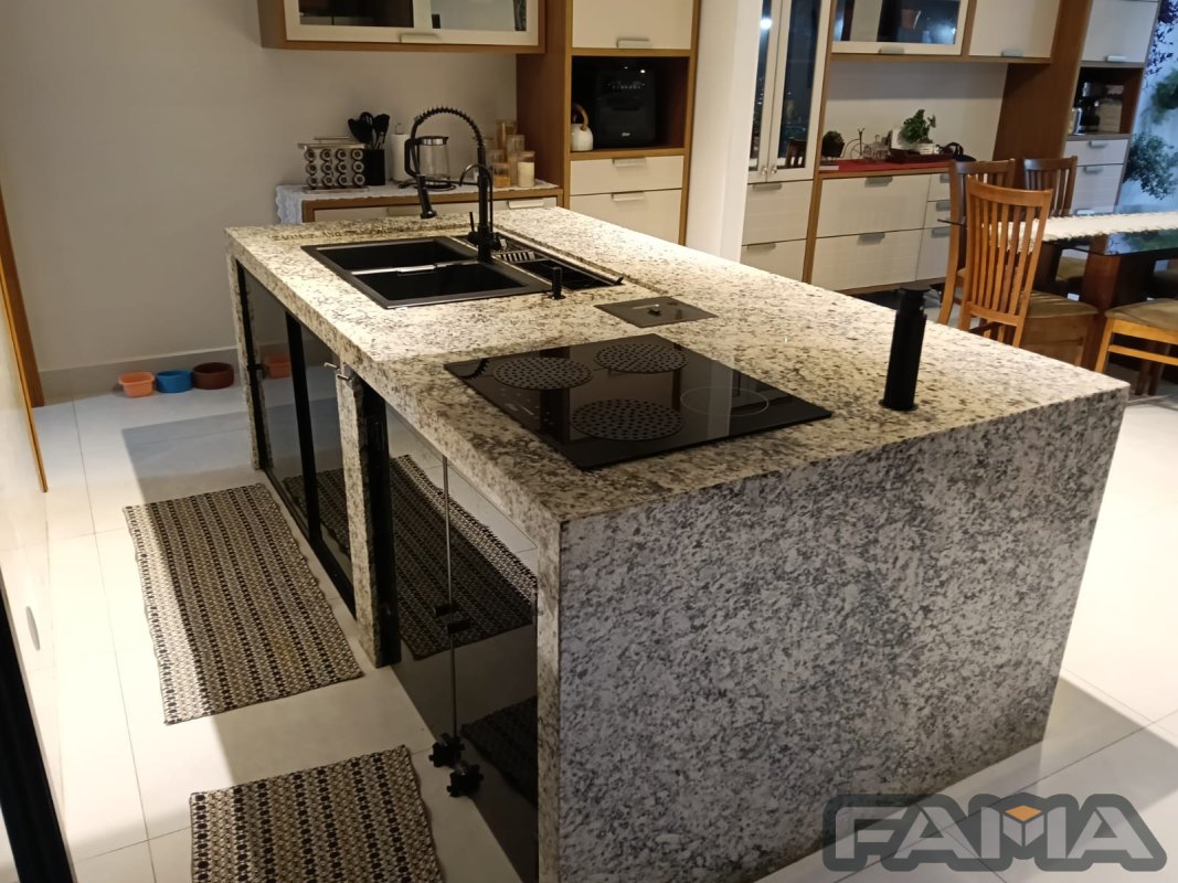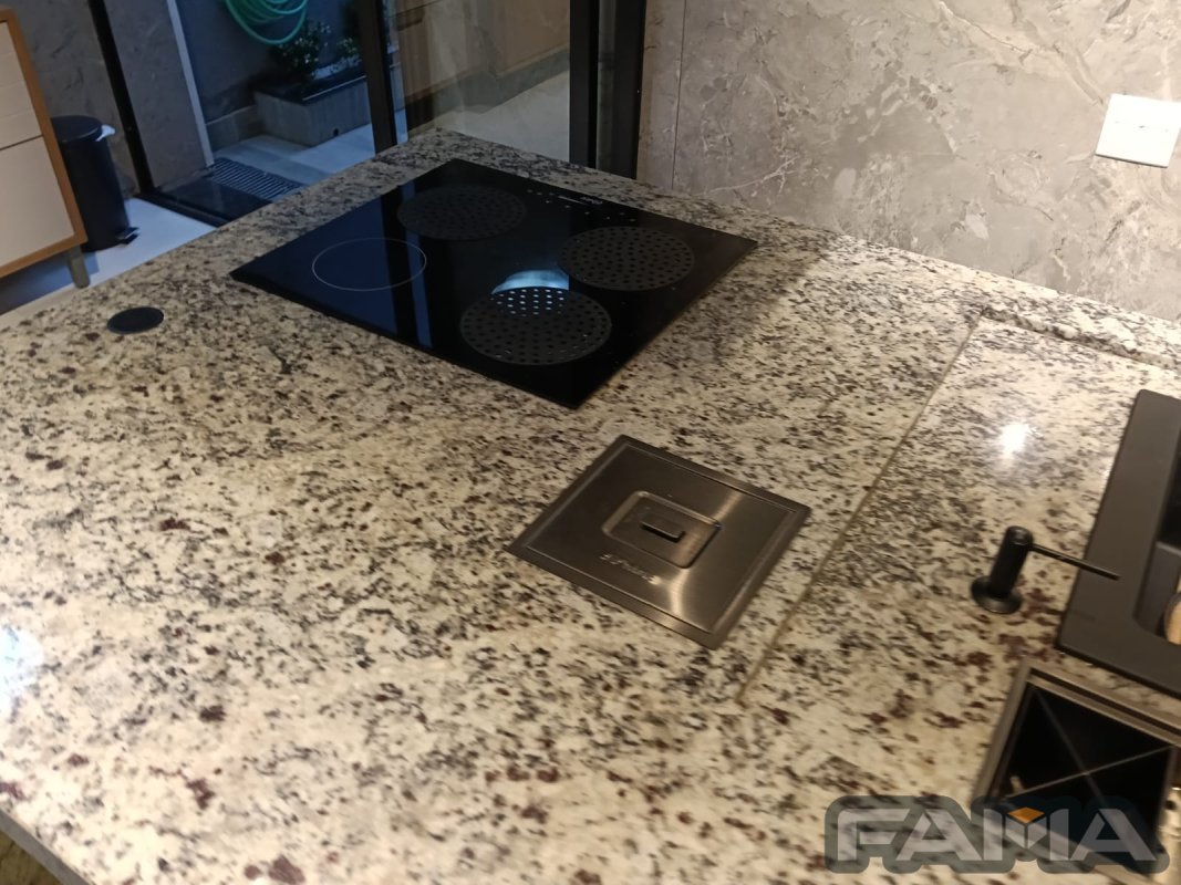 Área cozinha - dispõe de ilha com calha úmida, lixeira, Cooktop de indução, coifa de ilha, cuba dupla com